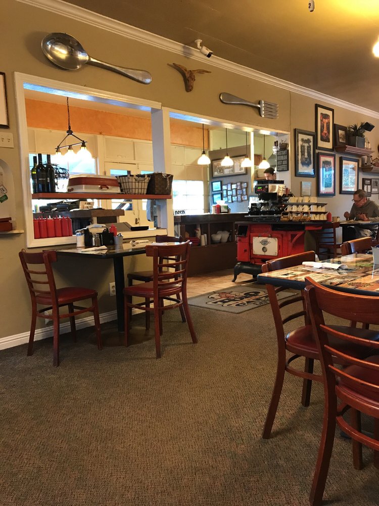 Incredibly friendly and casual roadside diner with a lovely patio and kitschy decor. The avocado benedict on the breakfast menu is excellent, and portions are huge.